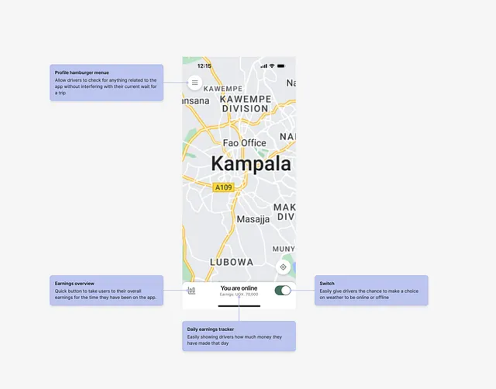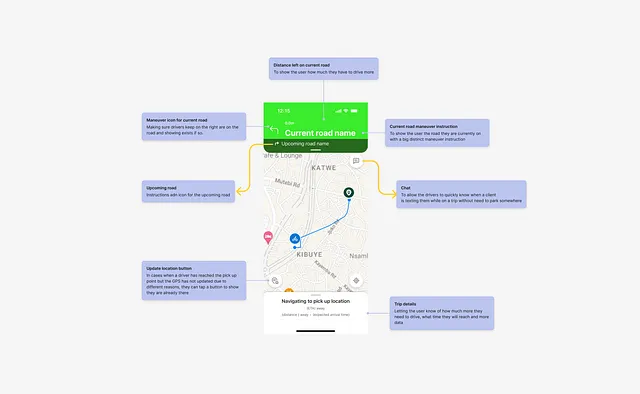 One of the core design principles behind the driver app was to ease the burden on drivers — allowing them to concentrate on delivering smooth, stress-free rides for everyone. My goal was to ensure that essential features were built right into the app, with navigation being a top priority. So we began with a fundamental question: What does effective navigation look like for a Boda Guy driver?